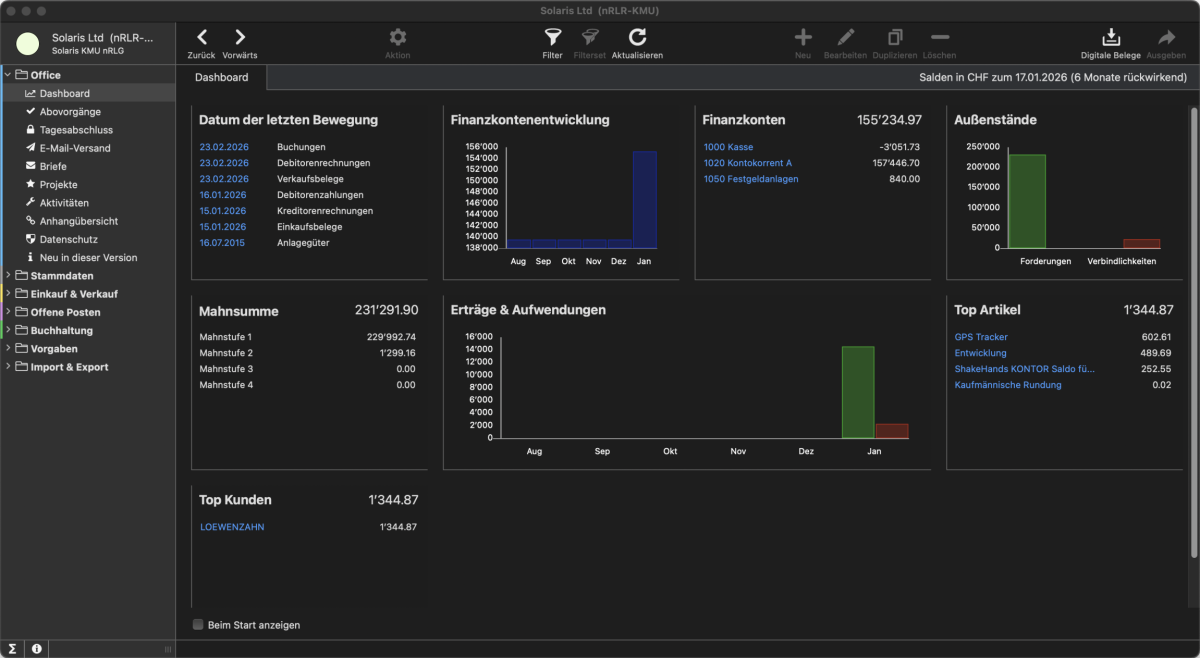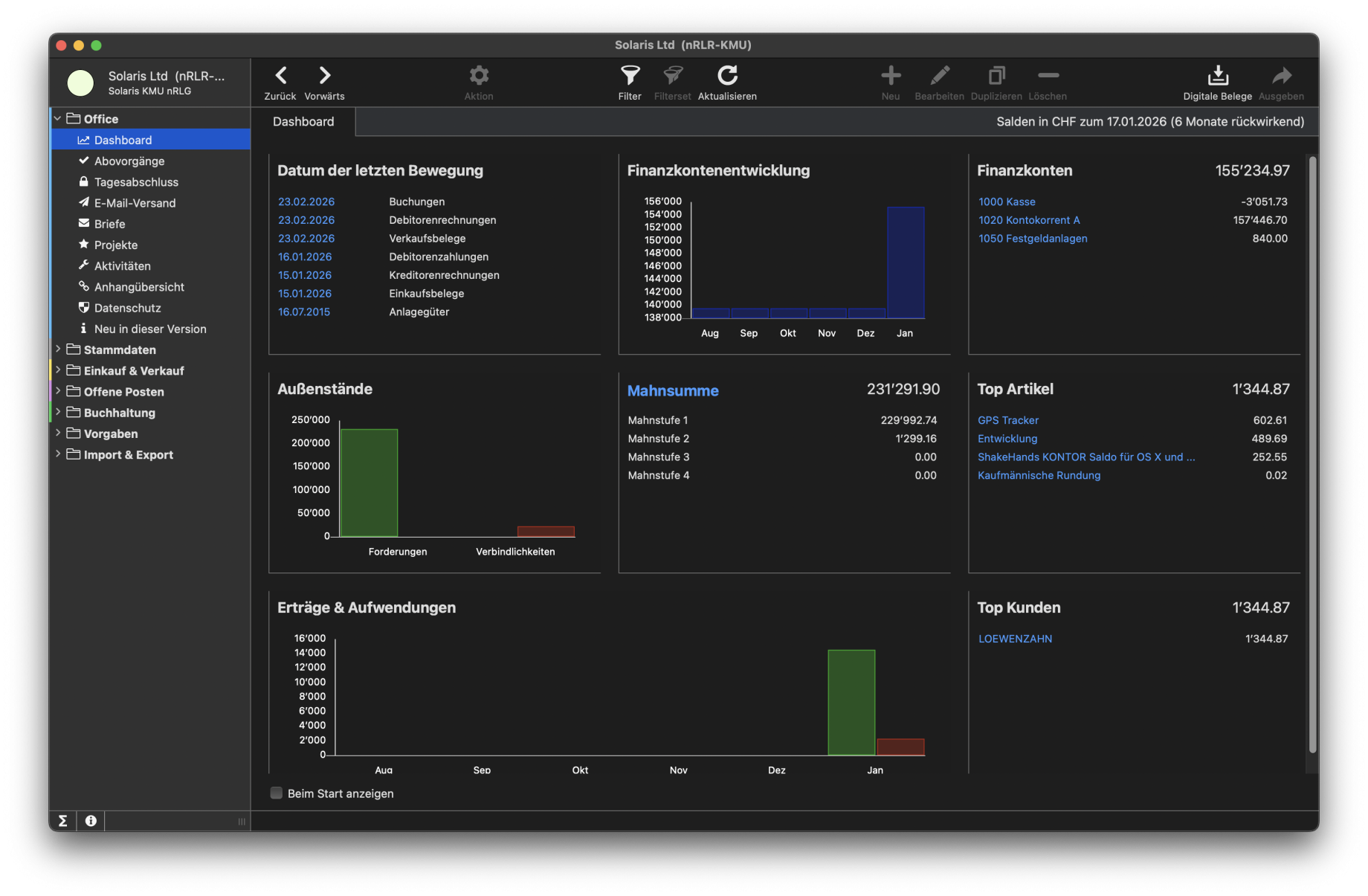 - Dashboard mit Übersichtsdiagrammen zur aktuellen Firma