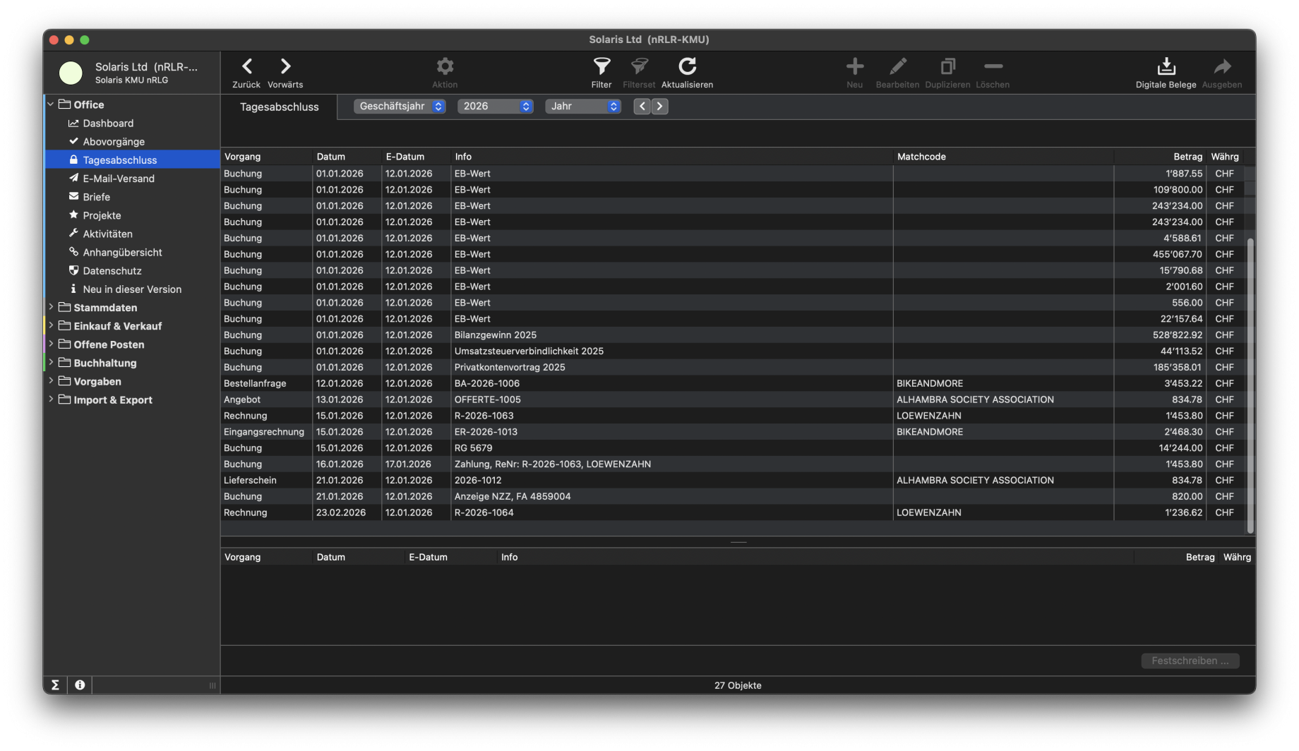 - (ab 14.2) Festschreibung in den Bereichen Einkauf, Verkauf, offene Posten und Buchungen.