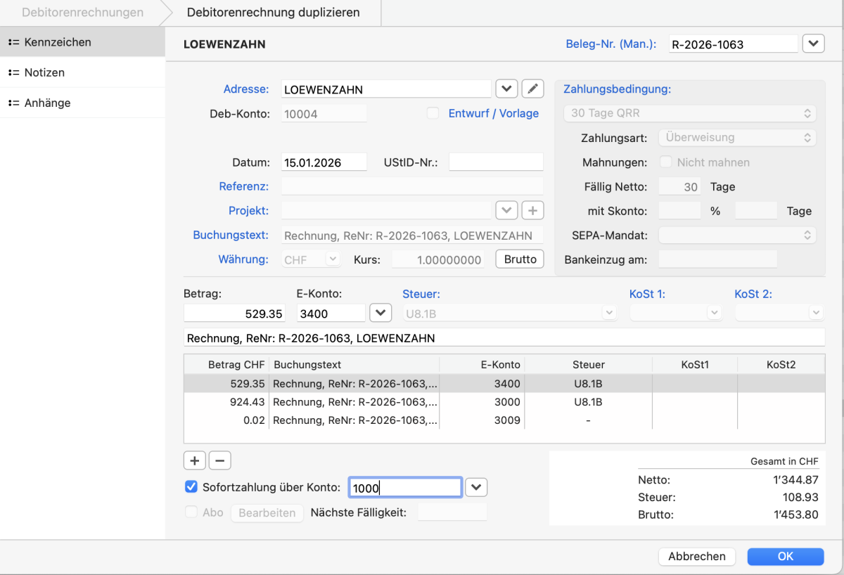 Das Erfassen von Offenen Posten sowie der dazugehörenden Zahlungen erfolgt normalerweise in unterschiedlichen Bereichen. Es gibt aber verschiedene Szenarien, z. B. bei Bareinnahmen an der Kasse oder bei einem Abbuchung via Kreditkarten, Paypal oder anderen Debit- und Credit-Zahlungsarten sowie mobilen Zahldiensten wie Twint und Cryptowährungen, in denen es schön wäre, eine Debitoren- oder Kreditorenrechnung sofort beim Erfassen auszugleichen und die Rechnung als bezahlt zu markieren und zu buchen.