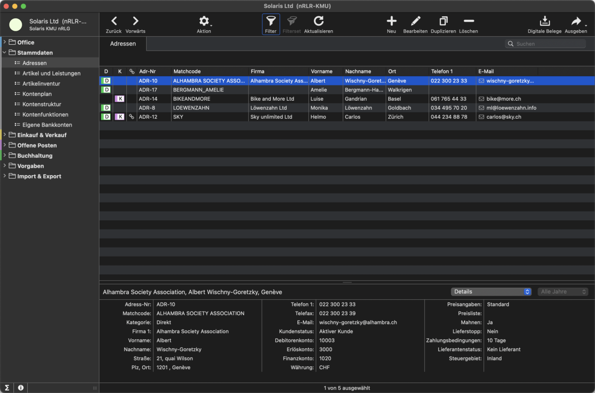 Dank der Nutzung von Stammdaten aus dem Adressbereich, einschliesslich aller Bankinformationen, sind sämtliche relevanten Daten in der Datenbank gespeichert. Mit dieser Funktion haben Sie für neue oder wiederkehrende Rechnungen jederzeit alle Informationen griffbereit und können diese bequem abrufen und bei Bedarf duplizieren. So bleibt Ihre Buchhaltung nicht nur zum Jahresende aktuell, sondern wird auch nach jeder Buchung stets auf dem neuesten Stand gehalten.
