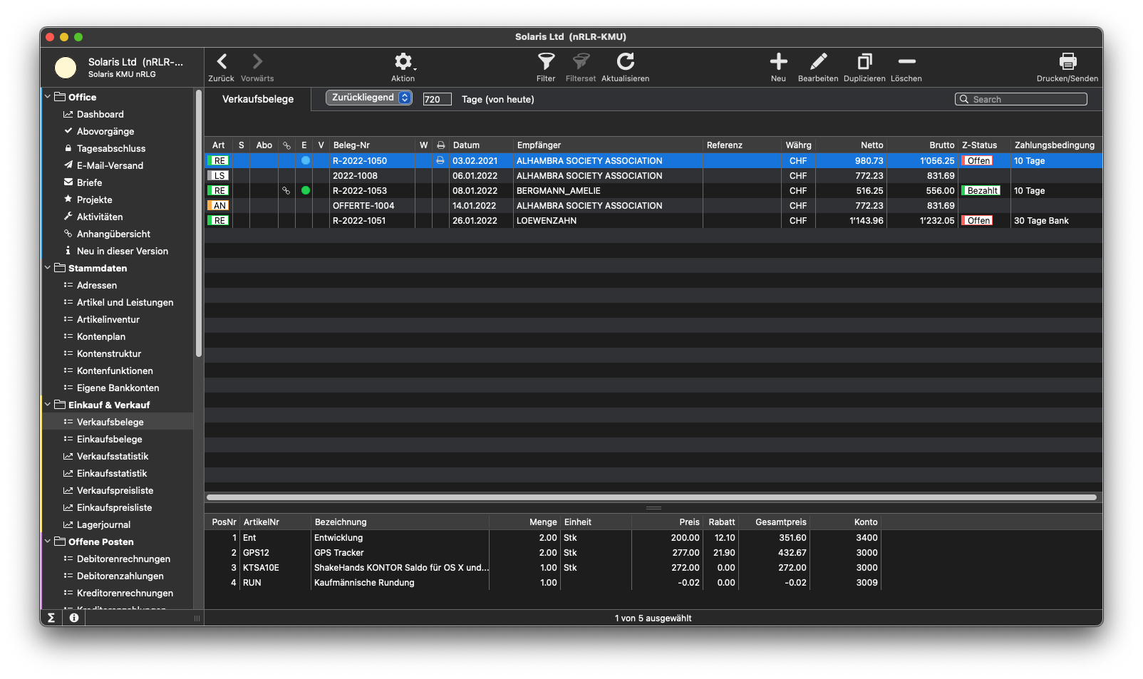 - Zahlungsstatus von Einkaufs- und Verkaufsbelegen wird in den Listen angezeigt; Stati sind offen, teilweise, bezahlt.